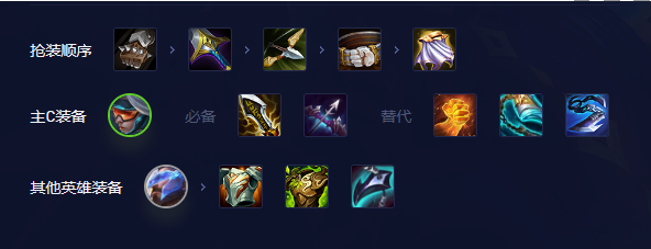 主C希维尔,轻语必备,主要目的破甲,虽然复制体有时候会携带,但不算稳定。第二件建议无尽,技能可暴击增加输出强度,第三件建议正义或破防,3暴击装,暴击直接拉满,大幅度增加输出强度,如没有就选择巨人杀手、鬼索、或死亡之刃,加班费下最优死亡之刃+无尽+巨杀。
