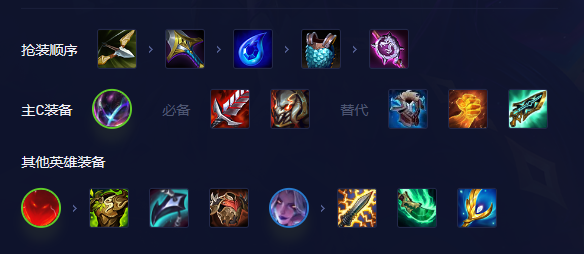 副C莫甘娜装备上建议电刃,搭配莫甘娜技能可降低敌方大部分棋子双抗。第二件建议朔极之矛或鬼索,主要是为了增加技能释放频率,第三件法强装备都可,最优大天使,20秒后的收益非常高。