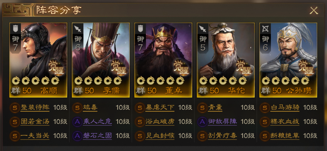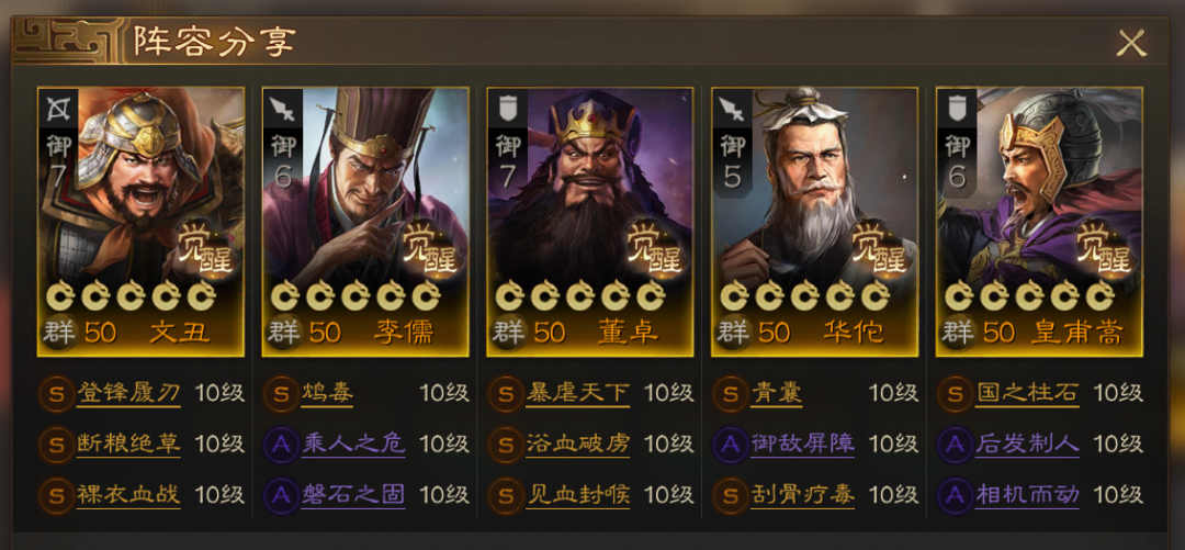 这个阵容的关键在于 董卓、李儒 的毒伤害,还有华佗的群体强力治疗提供续航,其他武将是可以替换的。