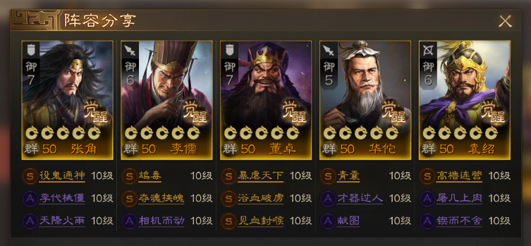 群雄叠毒召唤队,是由 张角、李儒、董卓、华佗、袁绍 组成的,看似和召唤队的阵容搭配很像,但实际打法逻辑是很不一样的。