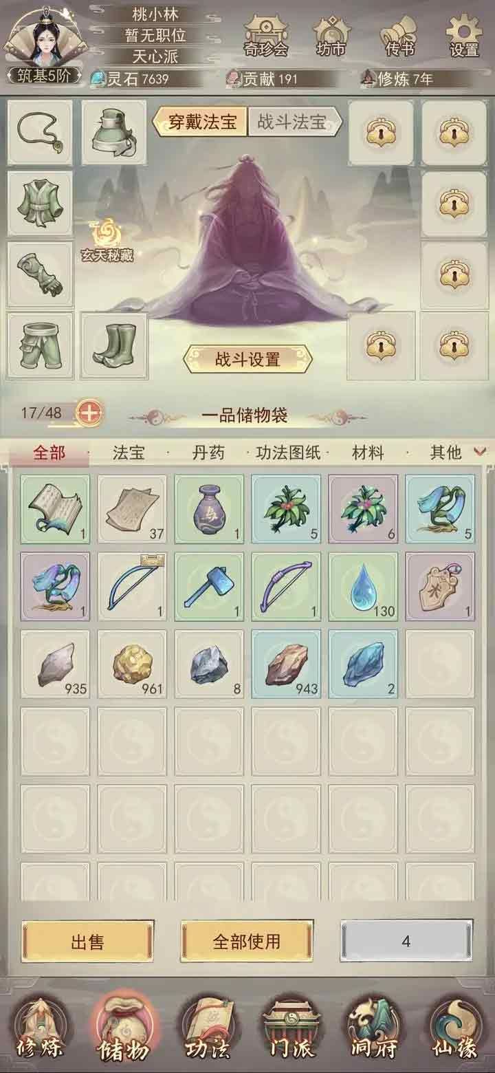 储物界面的初始穿戴法宝在仙缘探索获取,后续提升品级要在门派内学习图纸。