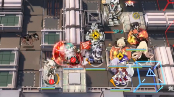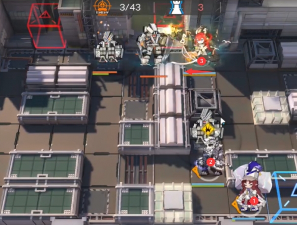 如图所示位置部署桃金娘产费,然后马上下山抗伤害,随后部署史尔特尔开黄昏切掉待机的机甲。