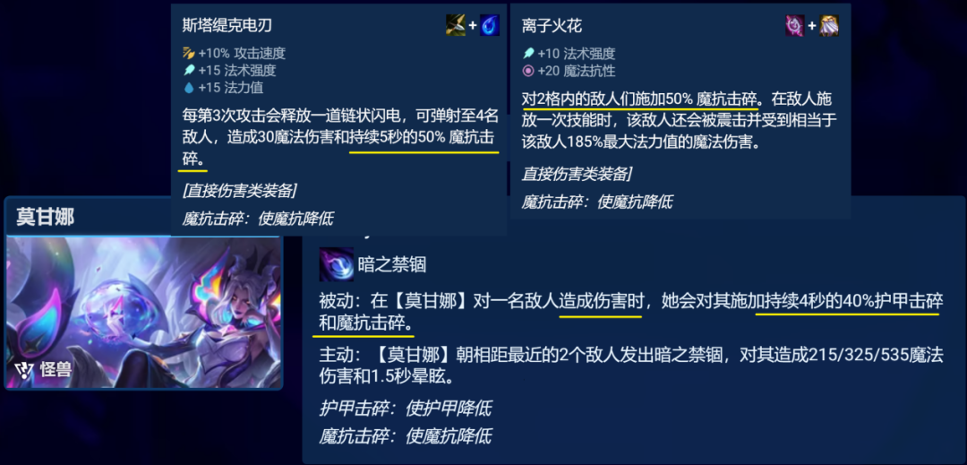 为了稳定通常我们会选择莫甘娜带电刃或崔斯特带电刃(高源九五大后期成型前最优的过渡棋子),特别是莫甘娜与电刃搭配收益非常高,莫甘娜被动造成伤害就能触发破甲与魔抗击碎,电刀造成的伤害也能触发被动,这样3次普攻造成多枚敌方棋子破甲与魔抗击碎。