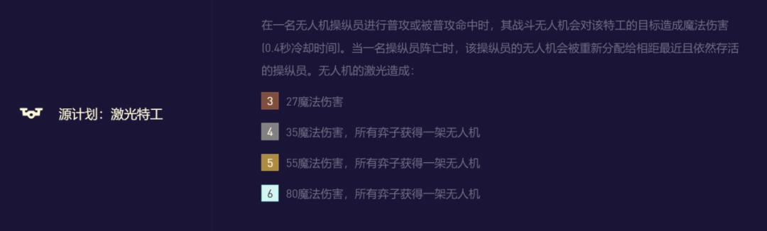 源计划羁绊的核心是能召唤小飞机,这个小飞机能造成魔法伤害(0.4/S冷却),且携带小飞机的棋子死后,还能被其他棋子继承(3源只能被源计划棋子继承)。很多兄弟一直以为源计划只有在普攻的时候小飞机才会跟着输出造成魔法伤害,其实不然在棋子被普攻的时候也会对目标造成伤害,携带小飞机的高坦棋子也能依靠多枚小飞机造成高伤害。