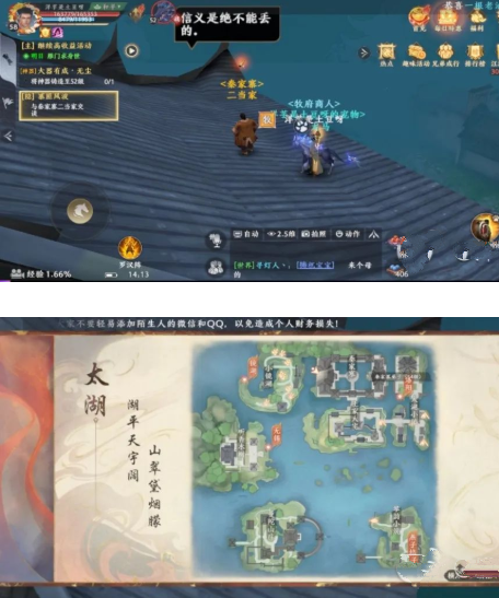 第一步是在太湖这个桥这里,然后在世界发:“秦家寨是乌合之众”,然后就可以和旁边船家对话了。