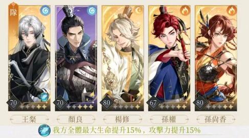 练度:王粲(队长)70+11,孙尚香、杨修80+13,孙权60+9(突破),颜良70+9