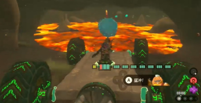 5.我们驾驶板车通过岩浆,继续往前走。