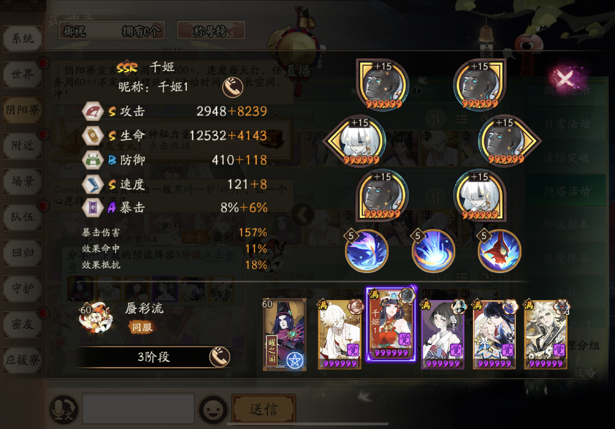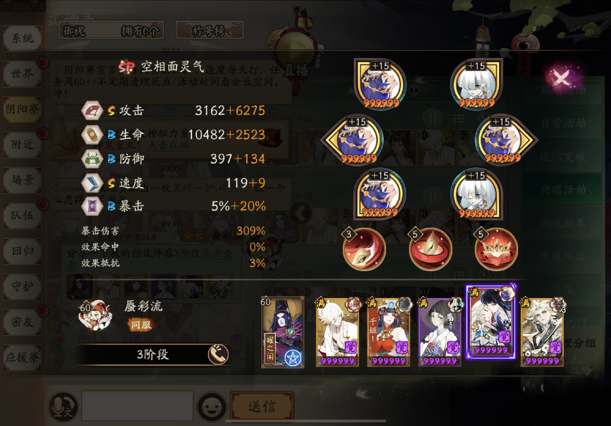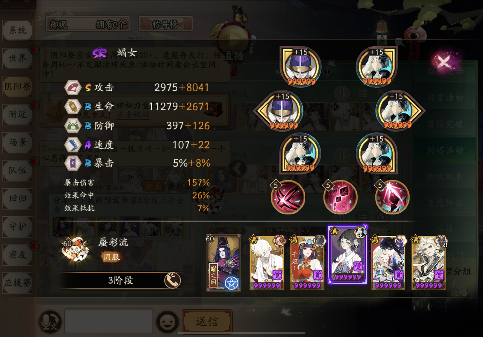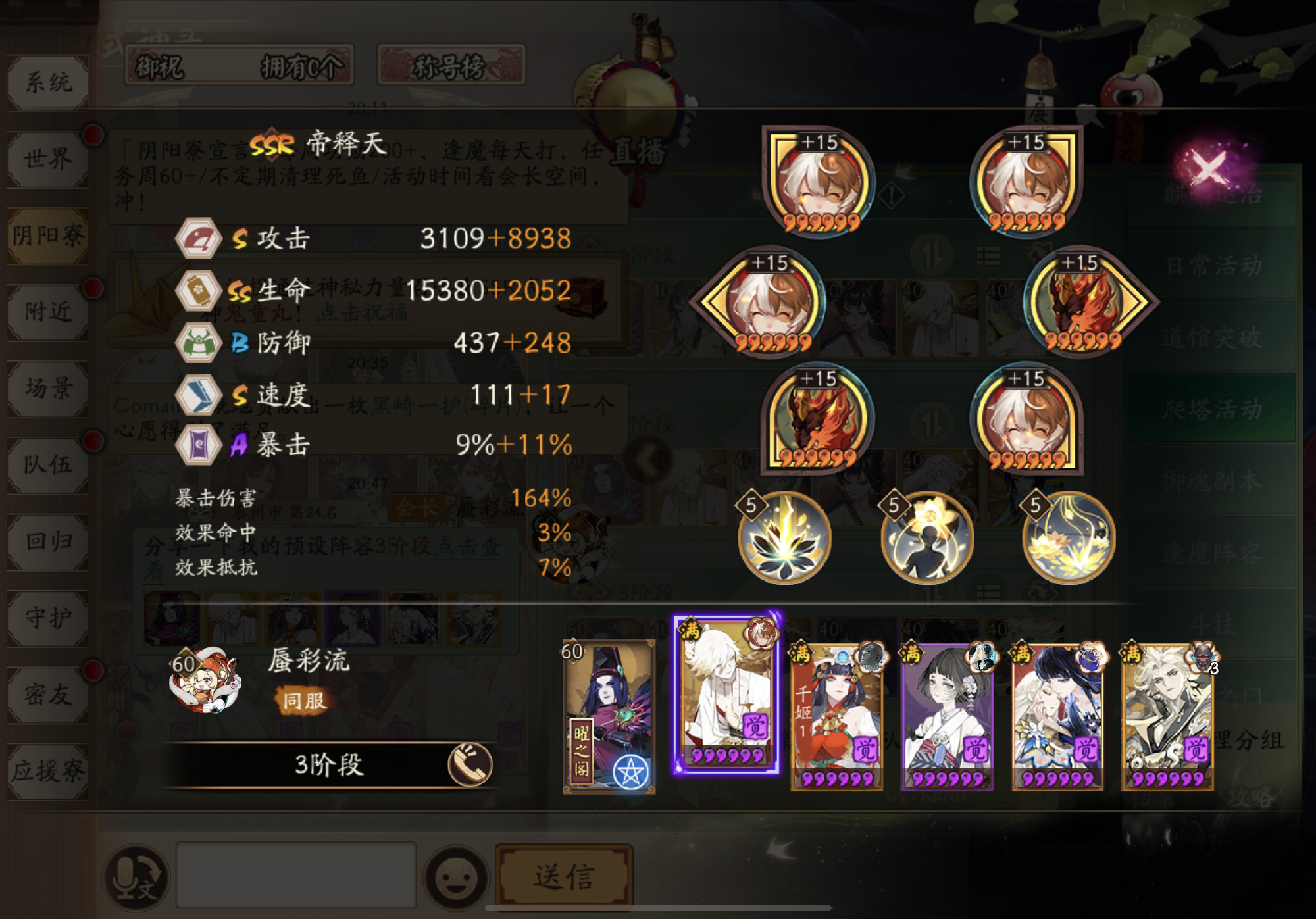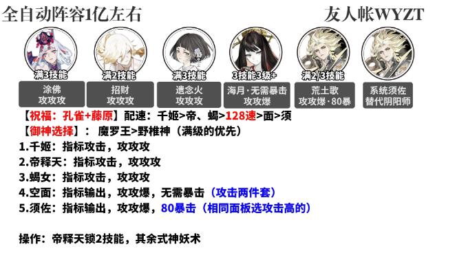 1、帝锁2技能,其余式神妖术,(阴阳师位置被系统须佐替代)。