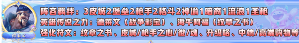 2.阵容羁绊:3皮尔沃特夫2堡垒2枪手2格斗2神谕1暗裔1流浪1圣枪。