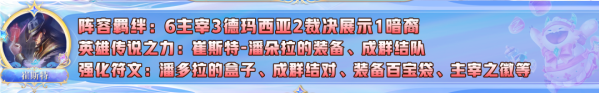 6.阵容运营:这套阵容只要开局拿崔斯特的英雄传传说之力就可以玩,没有任何的要求,只要在7人口追出3星盖伦就能够稳定前二。