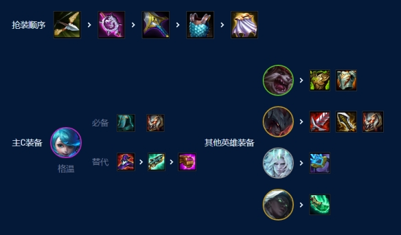 装备的话格温必备水银泰坦。第三件有多种选择。可以帽子、法爆、科技枪。物理输出给到剑魔。肉装给克烈。然后赛娜捡漏即可