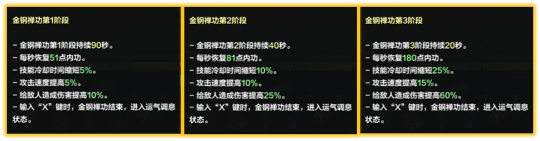 除去气功师自身的特性技能金刚禅功外,他还有三个BUFF技能