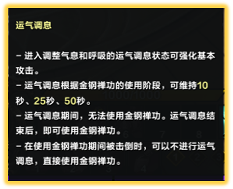 气功可以让自己常驻2阶段金刚禅功内,2阶段结束就慢慢调息,之后再次进入金刚禅功,1阶段可以短时间过渡呆一呆,三阶段一般只是收尾的时候才用,或者你知道后面会有一段长时间无法输出的空档期,否则其他时间不建议进金刚禅功的三阶段,断气的真空期实在太长了。
