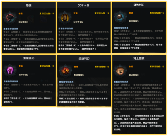 怨恨,咒术人偶,肾上腺素(会心流),极致利刃(会心流)。质量增加(迅捷流),迅捷利刃(迅捷流)。优先配好一个刻印(三级),再去配另一个。这样收益最大,每一个一级的蜻蜓点水配法收益极低。这里要优先配好一个刻印(三级),再去配另一个。这样收益最大,每一个一级的蜻蜓点水配法收益极低。另外,怨恨,咒术人偶这种带负面效果的,带1级刻印还不如不带。副本里死的太快可不行。