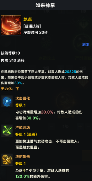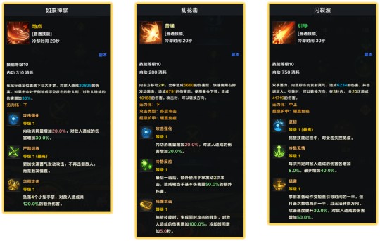 如来神掌,乱花击,闪裂波算是气功的所有技能里,伤害最高的技能,所以把这三个技能达到其他技能的增伤效果里尤为重要。