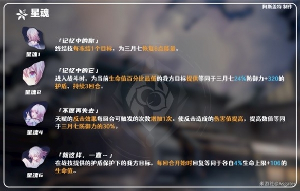 ◆总的来说,三月七的星魂提升较为平稳,本身0星魂时即可培养,命座更多是锦上添花、优化自身功能性,作为4星角色星魂自然是越高越好,1、2、4、6星魂的提升都是很不错的。