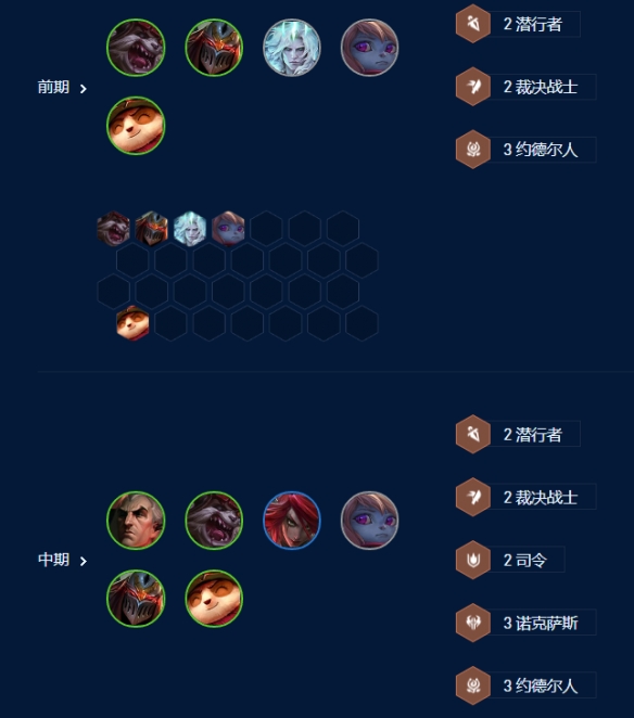 前期以3约和潜行牌为主,有3诺克萨斯且可以连胜可以用诺克萨斯连胜,尽量别掉太多血,把经济养起来。