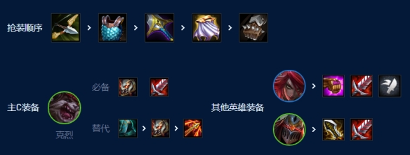 克烈必备泰坦,叠攻击力提供物理输出,叠法强提供护盾加成;饮血提供续航和护盾;最后一件看对局环境,万能装备是水银,如果不太需要水银,也可以用第二件泰坦或飓风等代替。卡特琳娜如果可以做出杀手转最好,没有的话有什么合什么,AP系的加续航。最后再考虑劫的装备,因为劫的物理装备与克烈冲突,优先级较低。