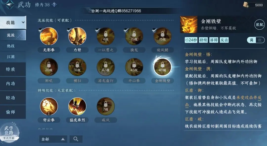 金刚铁壁:给队友提升防御力的buff技能,打PVP还是PVE都非常好用。主动释放也分御和破两种,御形态可以展开一面盾牌抗伤,再次释放附带一个冲阵的控制效果;破形态下是持续性的AOE伤害,论实用性还是御形态下更高。