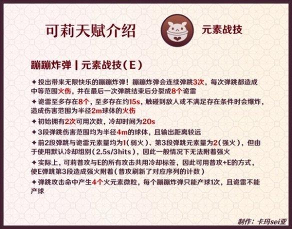 ?适合触发部分元素反应。可莉重击附着与伤害机制非常契合蒸发反应,且伤害范围也较适合触发烈绽放,但利用这些往往会导致总的天赋利用率欠佳。