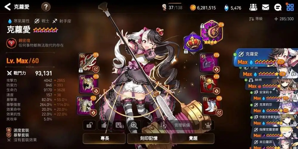 一般用这个角色比较推荐的是愤怒+暴击,或者愤怒+贯穿。愤怒套的特点是对有负面状态的敌人攻击时提升30%的最终伤害,刚好契合克萝爱2技能给敌人挂上的魔法钉,能打出更高的输出,这个相信大家能理解。