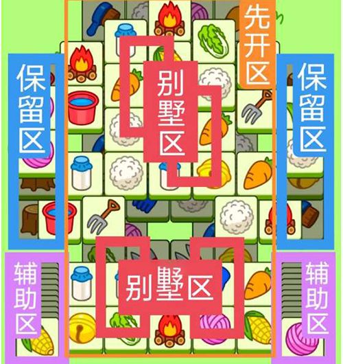 一个2+2+2叠牌大别墅,一个工字型大别墅,开局先消除橙色区,然后按照一层层均匀消除表面牌,哪里压牌比较多就先消除哪里,必要时可以用盲盒区辅助消除表面牌,尽量还是以别墅区内互相消除为主,蓝色区有叠牌,但是不多,全部保留到后期使用,下边两个是明牌