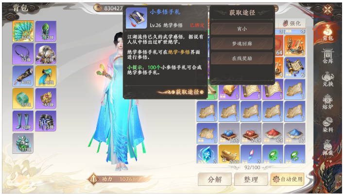 100个小参悟手札,可以合成绝学参悟手札,可以通过【宵小】、【梦魂回廊】、【在线奖励】等方式获得。