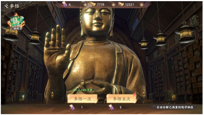 在打开的界面,少侠可以进行【参悟一次】/【参悟五次】,同时可以勾选“自动分解已经满重的绝学秘技”