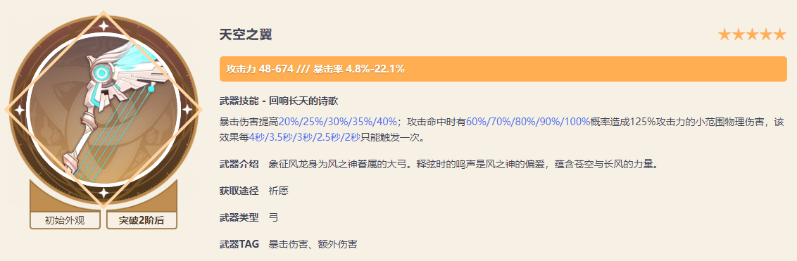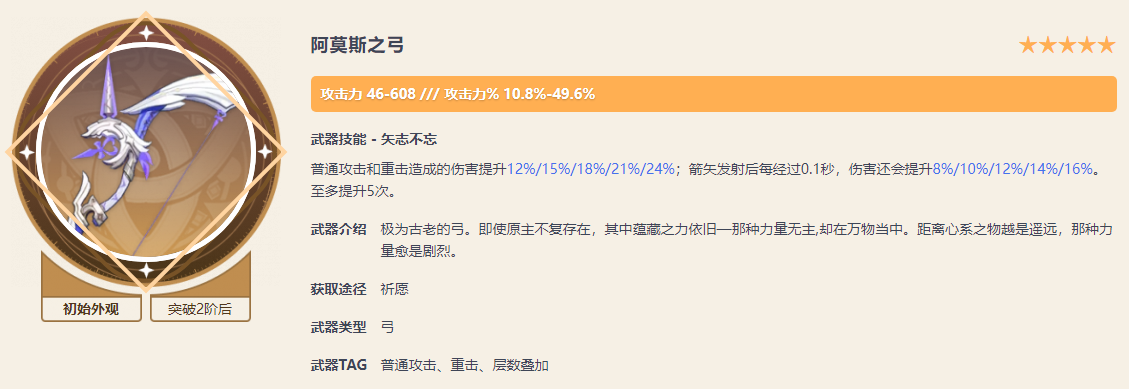 主词条和副词条都是攻击力,这点比不上前面的增加暴击率呢,不过被动的普通攻击和重击增加伤害还是非常可观的,并且它还有一个很变态的效果,就是我们的箭飞出去的时间越长,命中敌人时的伤害就会越高。
