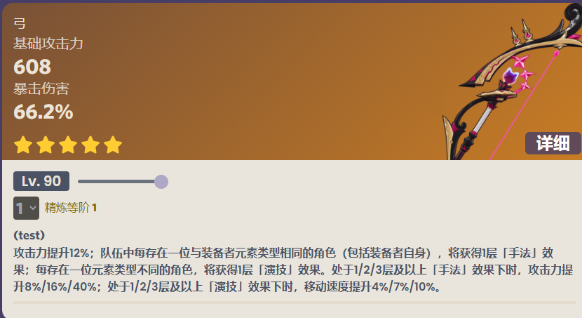 1、武器的效果是攻击力提升百分之12,每存在一位与装备者元素相同的角色,包括装备者自身,就会获得一个效果,每存在一个元素类型的不同角色,就会获得另一个效果;