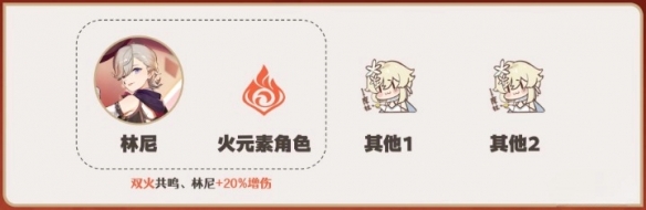 利用固有天赋2的增伤效果,再搭配1-2名火元素角色后,提高林尼造成的伤害。但并不意味着一定要组成“三火队”、甚至“四火队”。