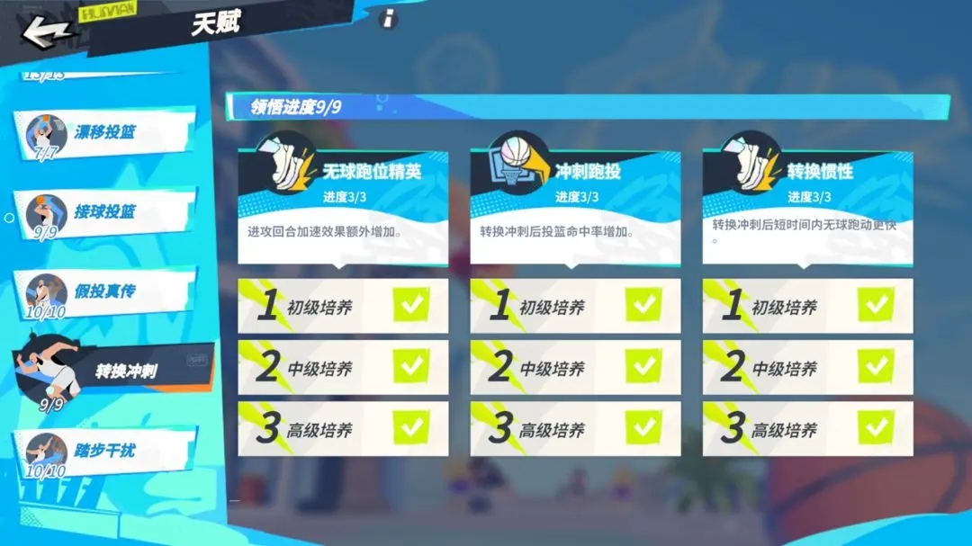 转换冲刺天赋,提升进攻回合加速效果,够提高转换冲刺之后接球投篮的命中率,还会让技能无球跑动时的速度更快,更容易甩开对方防守。