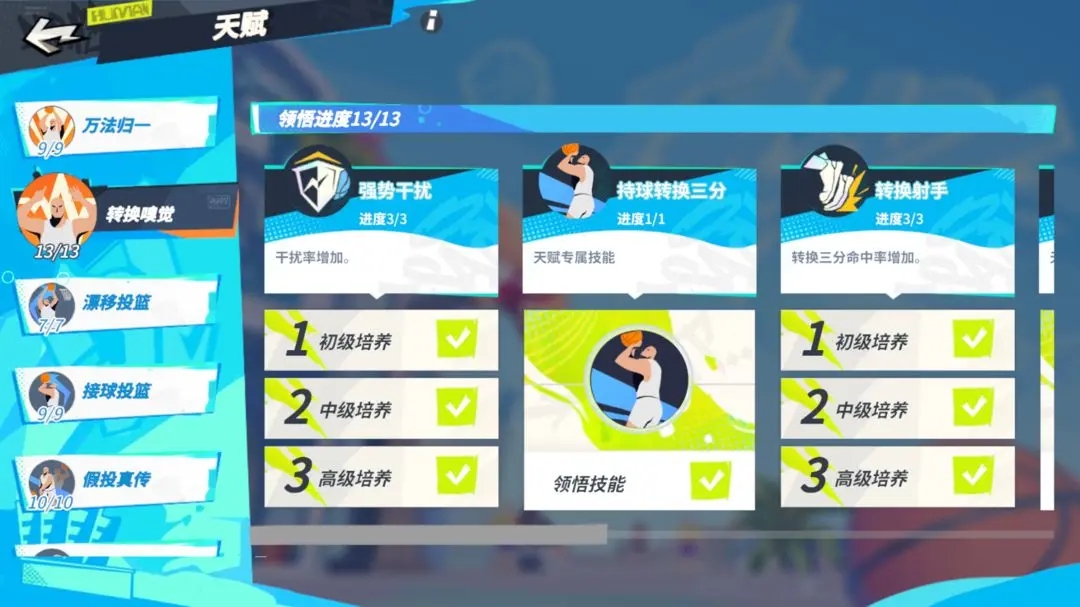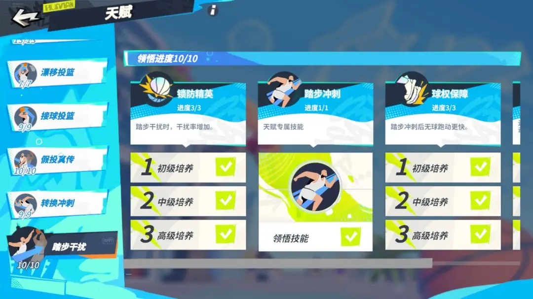 针对防守达人的定位,各位街球手在选择潜能时,尽量将数值增加集中在抢断、干扰以及稳定等防守能力上,可以适当增加得分能力。