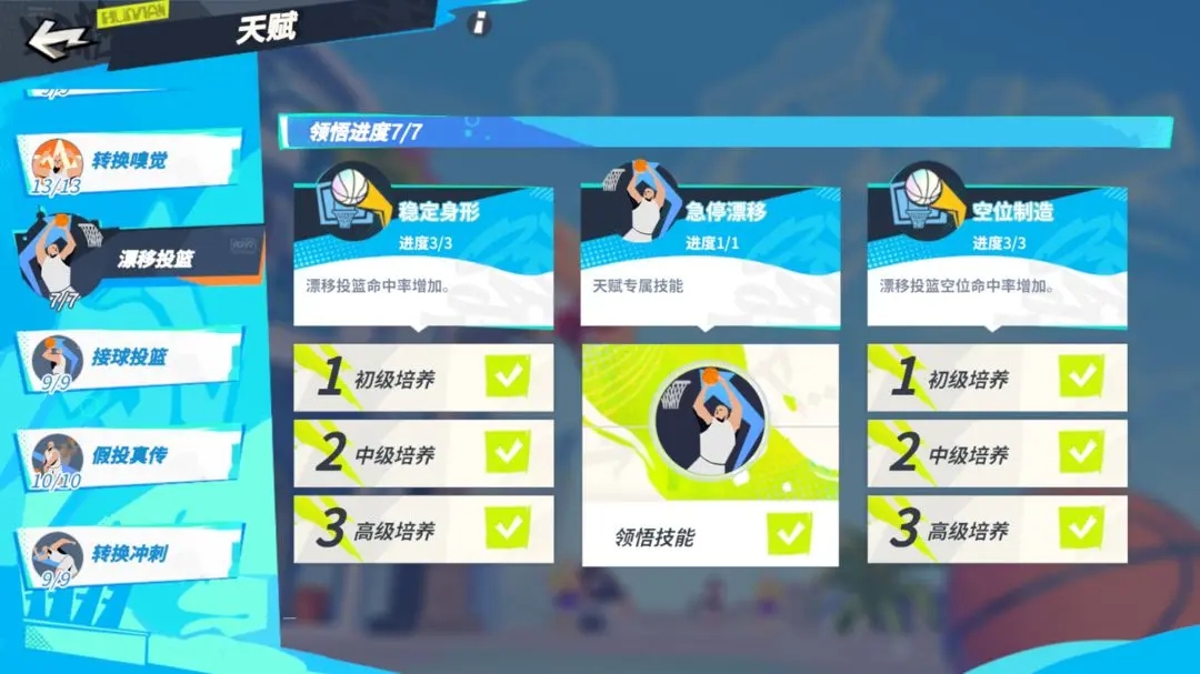 漂移投篮可以提升技能投篮及空位命中率,解锁技能专属天赋“急停飘逸”后,球员使用漂移投篮,可以往反方向漂移,提高防守难度。