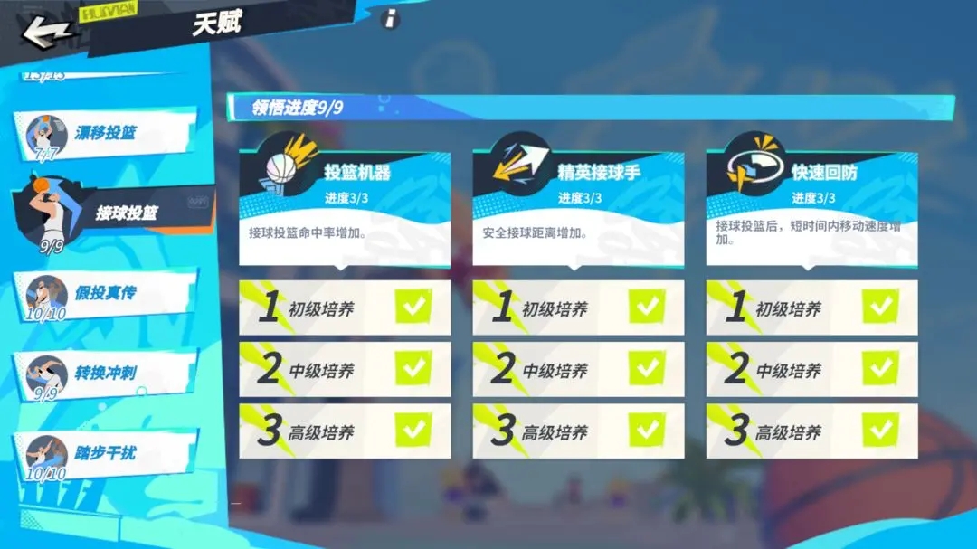 接球投篮天赋提升技能投篮命中率,增加接球时的安全距离,防止被对手拦截抢断,还可以让球员在接球投篮后短暂地增加移动速度,方便攻守转换时的快速回防。