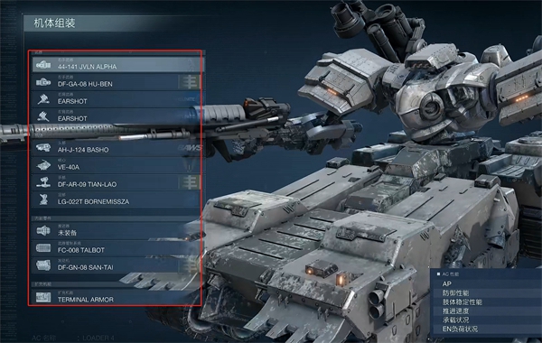 如同这套配装的名字一样,我们需要通过放弃在空中的灵动性,将机甲的双腿换成类似于坦克履带的移动设备,以换取优秀的承重以及防御属性;