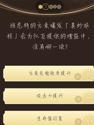 问题六:班尼特的元素爆发「美妙旅程」会为队友提供的增益中,没有那一项?元素充能效率提升