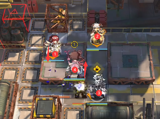 如图所示部署顺序:能天使(向下)→ 塞雷亚 → 山(开技能) → 艾雅法拉(向上).