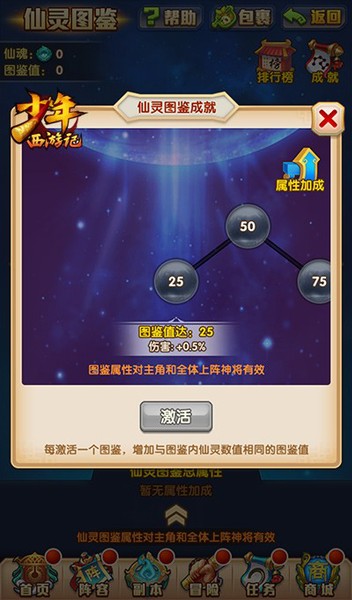 《少年西游记》中,当点亮【仙灵图鉴】时可对全体神将产生增益。而在新版本中,神将的增益将得到进一步的提升。少年们在点亮图鉴的同时,将获得与仙灵数值相同的【图鉴值】,当【图鉴值】达到指定的额度时将激活【仙灵成就】。【仙灵成就】提升的属性将对全体上阵神将生效,为少年们提供更强大的战力!
