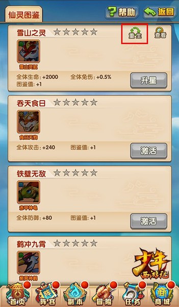 在仙灵系统中,激活仙灵图鉴将同时消耗一个对应的仙灵。为避免少年们因误操作而造成的仙灵减员,新版本中新增了【重生】功能,可将用于激活图鉴的仙灵重生,即返还一个激活时消耗的仙灵。
