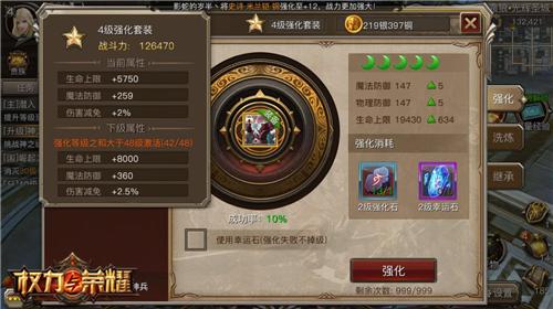 在神兵的强化上则需量力而行,有实力不是关键,毕竟是个看脸的时代,非洲酋长还是要努力洗白才行。在强化界面上会显示强化成功率,如果手里有幸运石就不要吝惜,因为幸运石可以保证在强化失败后不会掉落星级。强化等级之和达到一定数值还可以开启强化套装,六位数的战力加成是不是诱惑极大?勇士们,快买好幸运石一起来“欧洲”强化出一身神装吧!