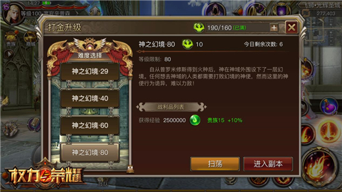 这就要提到“神之幻境”副本了,作为快速集中获取海量经验的副本应该可以满足你升级的欲望了,不同的可选难度也很贴心地照顾到玩家当前的战力情况,如果你是“贵族”,还能在这里得到额外经验加成,非常爽快。如果你还想获得更多挑战机会,可以提升贵族等级、购买黄金特权卡的方式增加副本次数,助你一步步领先别人走向巅峰!