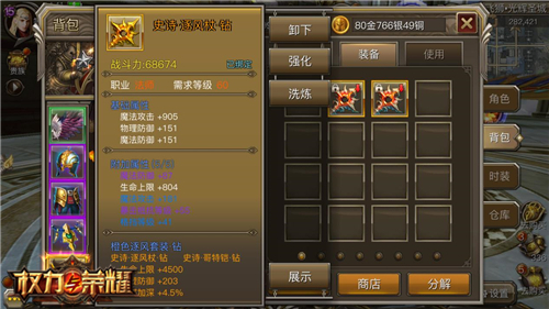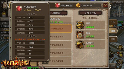随着等级提升,装备也会不断升级、升阶,六件装备分别可以镶嵌多块宝石,玩家可以通过活动或者商城购买并合成高等级宝石。作为最稳扎稳打的升战力方式,高等级的宝石不仅能提供战力,还可以在所有宝石等级之和达到一定数值时,开启宝石套装属性加成。1级套装可加成34375战力,之后每级套装效果提升都会拥有3~4W的战力加成,打造一套强悍的宝石套装,轻轻松松加几十万战力不是问题!