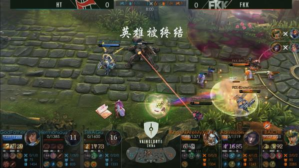 直到8分钟FKK在HT的塔下混战,凭借着黑法强势的攻击力直接收走两个人头和一塔,风头一时无两。然而一分钟后,HT借助FKK的黑法一个走位的失误,成功拿下黑法的高额人头和一塔,但是在撤退的时候塔卡不慎被睡中,人头数再次被拉开。但是双方的经济却非常接近,HT可谓输人头不输经济。