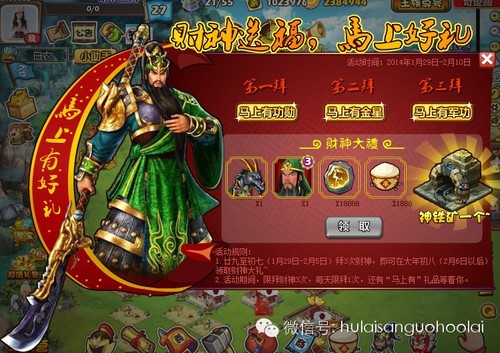 本次的三国第一神将关羽,将为大家带来财神大礼!!只需在廿九至初七(1月29日-2月6日)登陆3次游戏参加活动,即可在大年初八后免费领取财神大礼~(风暴马,3星真关羽,霹雳石*18888,军粮*1888,还有每天产出1块神铁的神级建筑:神铁矿!!),千万不要错过哦~