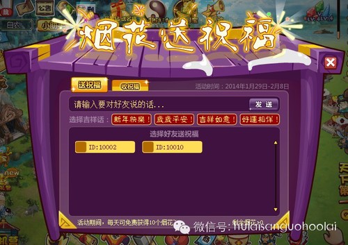 新年走亲访友的时候,也别忘了给胡莱三国的小伙伴儿们,送去新年的祝福哦!好友收到你的祝福后,将会在她的出城看到华丽的烟花祝福!可以选择系统的四个吉祥语,也可以编辑自己说的话,送去祝福~,每天登陆游戏即可免费获赠10个烟花~就让新年快乐与祝福,沉浸在绚丽的烟花里吧~