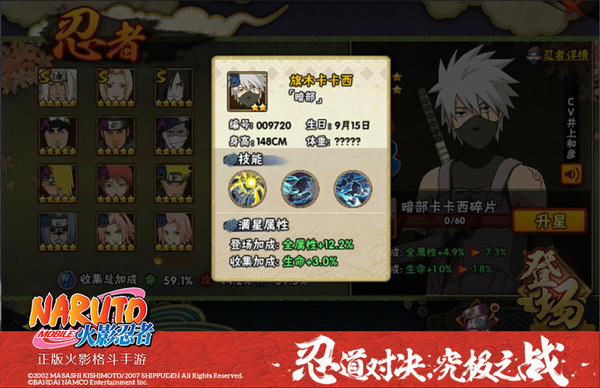 作为《火影忍者》动漫原著最具人气的忍者,旗木卡卡西即将以【暗部】的形态降临正版火影格斗手游《火影忍者》。届时,所有忍者学员皆有机会体验其天才般忍者的实力,准备迎接木叶第一技师旗木卡卡西【暗部】吧!