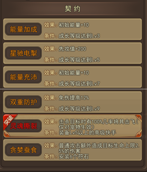 再来看看新宠契约⑤突破后的终极契约击杀目标可以100%击飞宠物!好嘛,其实哪怕一半的几率击飞,那也是非常骇人的吧!契约⑥普通攻击是必先攻击防御宠,而额外造成其生命上限百分比伤害,这个小编可以任性的认为额外伤害是无视对方肉宠防御的么!