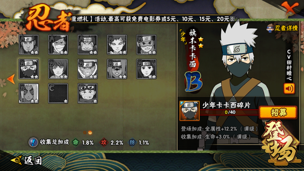 活动内容:活动期间,礼包商店上架“神秘忍者礼包”,购买礼包将有较高几率获得“旗木卡卡西(少年)”碎片*5,每人限购50次。