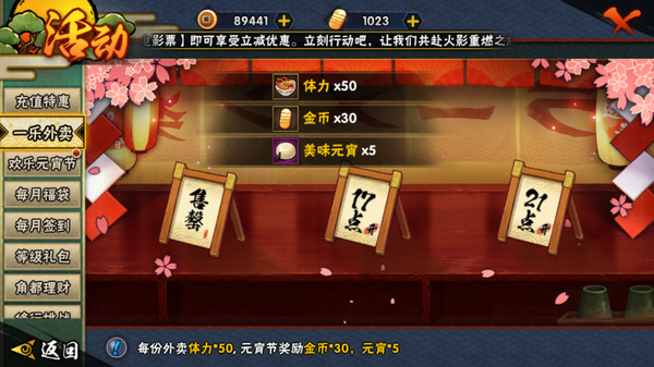 活动内容:活动期间,每天单笔充值25元即可领取一次超值回馈礼包,包括:4级红勾玉*1、体力*200、元宵*10、随机B级忍者碎片(包括君麻吕【咒印】、漩涡鸣人【一尾】、宇智波佐助【咒印】、红、红豆)*2。